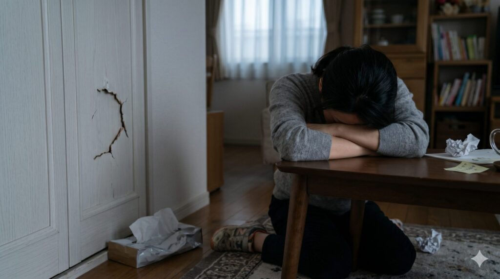 子供の泣き声が恐怖になり、感情がコントロールできなくなってクローゼットを蹴飛ばし大きな穴を開けたこと(修繕費7万円なり)、ティッシュボックスを思い切り踏み潰した事…